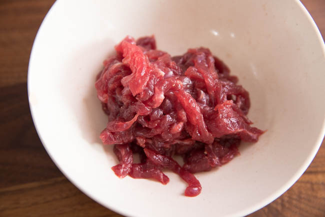 - Cut beef into shreds and marinate with salt, sugar, white pepper and cooking wine. Mix well and set aside fro 10 minutes.