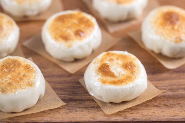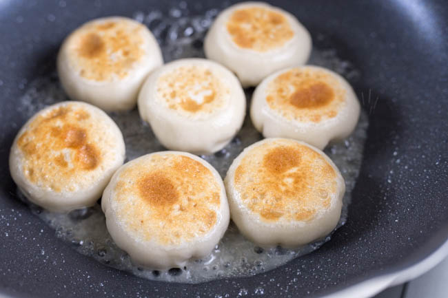 • Brush some oil in pan, place the dumplings in. Fry over middle fire until the bottom becomes crispy and the turn over and fry the other side. Once both side becomes crispy, let the smooth side up and pour in around 1/4 cup of hot water. Cover the lid and slow down the fire, cook for another 3 -4 minutes or until the water is almost gone. Continue frying the dumpling for a while to make it crispy again. You can beat the surface and listen to the clean sound when they are done.