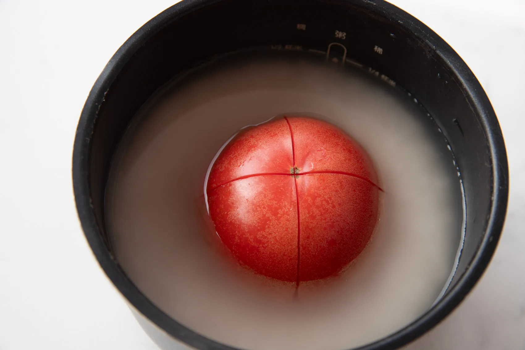 • Clean the tomatoes and then cut two lines crossing on the surface.