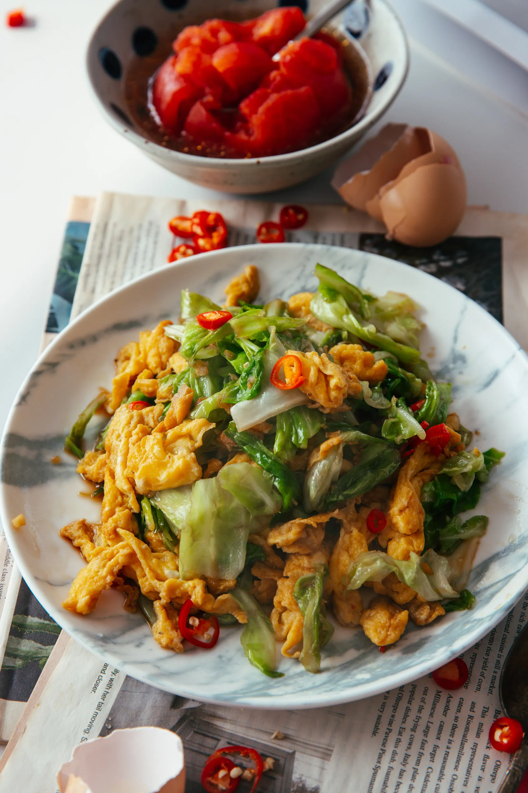 For this recipe, I fry the egg and cabbage separately, while another way popular in some Chinese restaurants is to coat the egg over the cabbage and fry together. With the former stir-frying method, you can taste the tastes from the egg and cabbage. In the second way, the sweetness and crunchiness of the cabbage dominate over the egg.