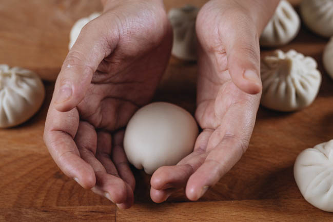 • Place around 1 tablespoon of filling in center. Seal the wrapper completely and then turn over and shape the dumpling for a higher and thicker round shape.