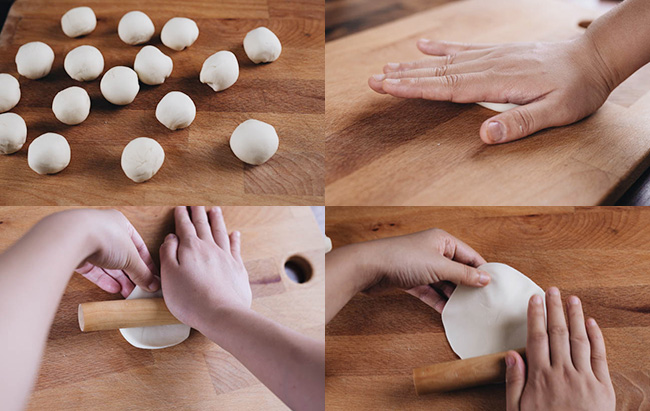 • Get the dough out and shape into a long log and then divide into 16 portions. Press each one down and roll out to a wrapper around 12 cm in diameter, with thinner edges and thicker center.